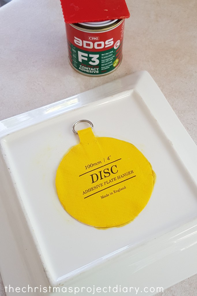 I purchased a couple of Invisible Disc Plate Hangers, which adhere to the back of items you wish to hang. Because of the weight of the platter, I also chose to add some extra glue adhesive, so it will hopefully be very secure.