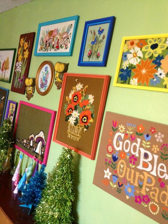 This vibrant wall display is so appealing. The owner of this studio is said to have found these various needlework items when out charity shop shopping….they create such amazing visual impact displayed like this alongside each other!