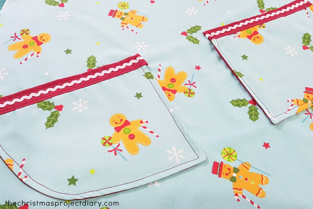 I am pleased with how each of the pockets ended up looking. They made this apron look quite different from the previous Christmas one I made, which is also in the exact same fabrics.